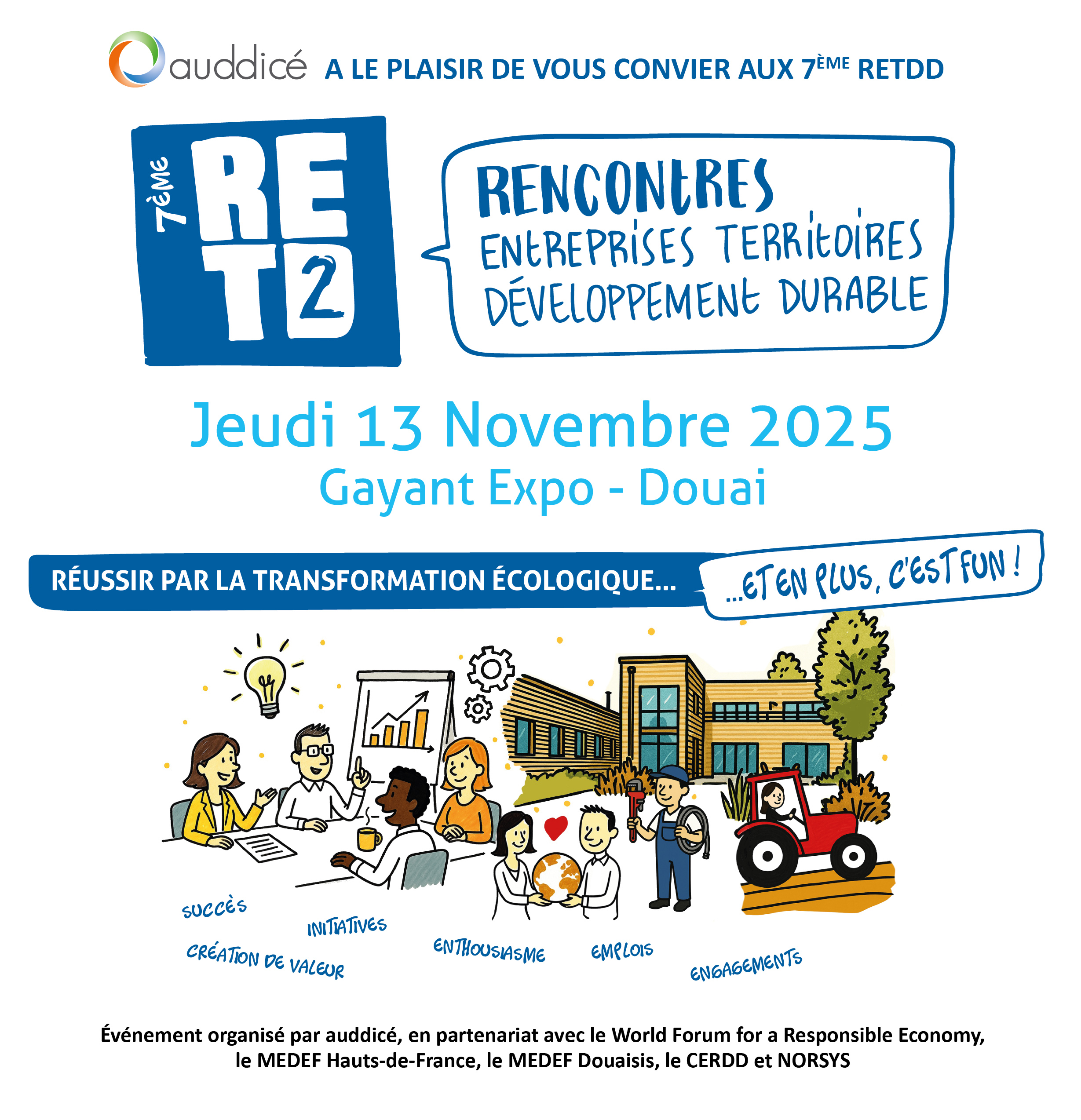 auddicé a le plaisir de vous convier à la 7ème édition des Rencontres Entreprises Territoires Développement Durable (RETDD) le jeudi 13 novembre 2025 à Gayant Expo - Douai.
