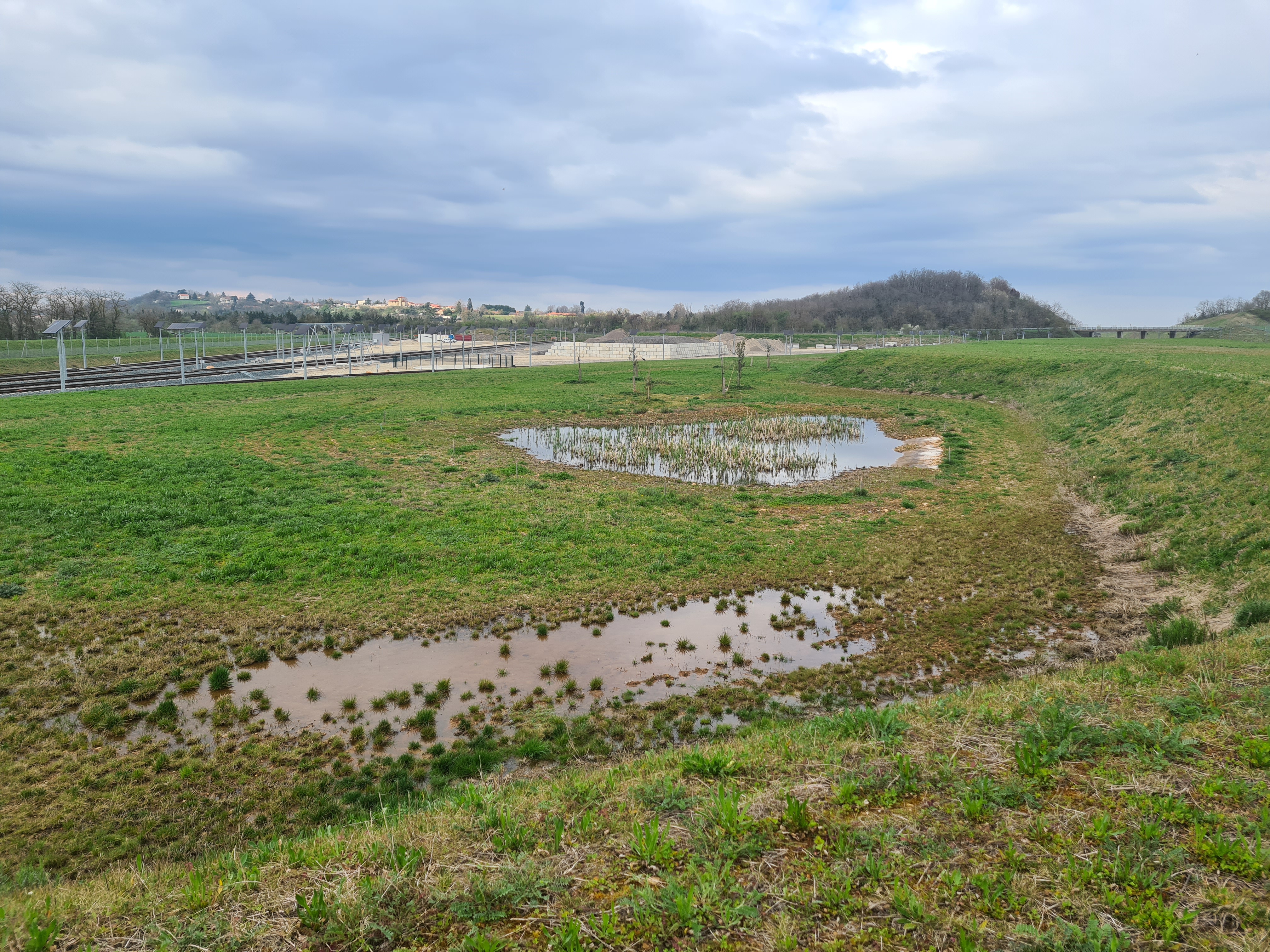 Les résultats montrent une nette amélioration de la diversité des habitats par rapport à l’état initial du site, qui était majoritairement occupé par des cultures agricoles. Le secteur comprend désormais des mares, des fourrés, des formations herbacées réensemencées ainsi que des zones artificialisées liées au réseau ferroviaire. Aussi, quatre pieds de l’Amni élevé (Ammi majus) ont été observés au sein du secteur. Cette espèce floristique est considérée en danger d’extinction sur la liste rouge de Rhône-Alpes. Malgré ces aménagements, plusieurs espèces végétales exotiques envahissantes (EVEE) restent présentes, et des mesures de gestion adaptées ont été préconisées.